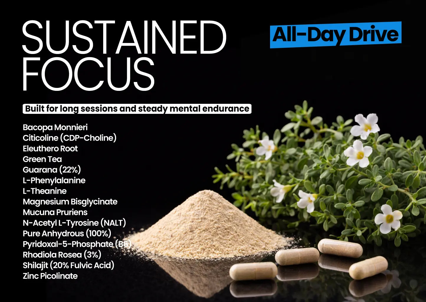 Fast-acting caffeine for immediate mental alertness.
